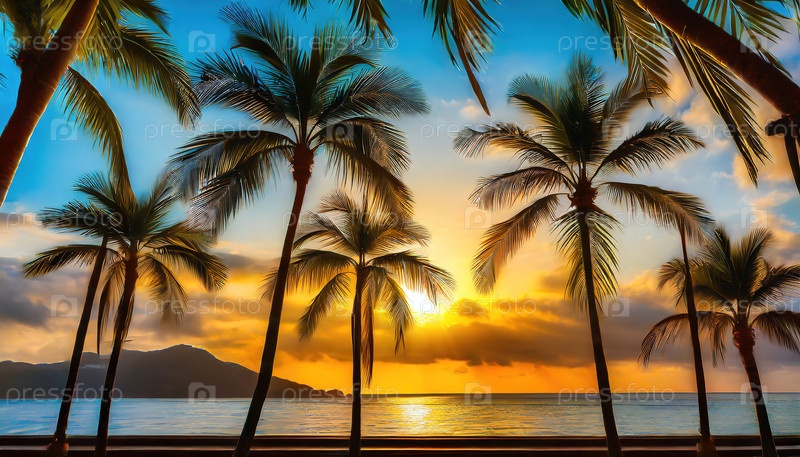 Силуэты пальмы на закате тропического солнца, представляющие путешествия, рай, отдых и экзотические прибрежные направления