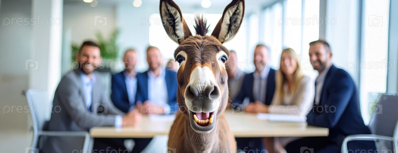 Осел занимает центральное место в корпоративной комнате совещаний, высмеивая офисную динамику, нетрадиционное лидерство или комическое облегчение в профессиональных условиях