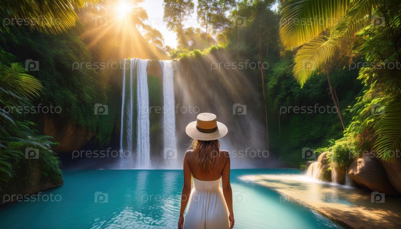 Женщина в белом платье и шляпе восхищается потрясающим тропическим водопадом, окруженным пышными джунглями и солнечным светом, сияющим сквозь деревья