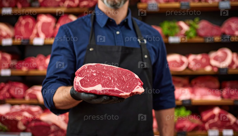 Мясник держит мраморный стейк в фокусе с фоном, наполненным мясными отрезками, символизирующими качество, свежесть и мастерство в розничной торговле продуктами питания