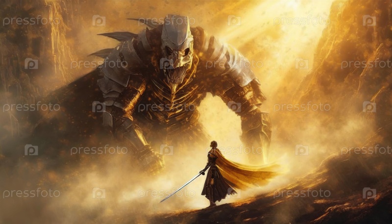 Воин в плаще сталкивается с массивным бронированным монстром в эпической фэнтезийной обстановке со золотым туманом