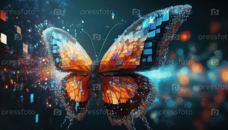 Цифровая бабочка из красочных пикселей дрожит в футуристической виртуальной среде