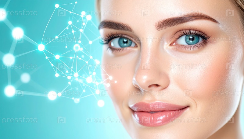 Покрытие лица женщины с цифровой сетевой графикой, представляющей технологии по уходу за кожей и красоты