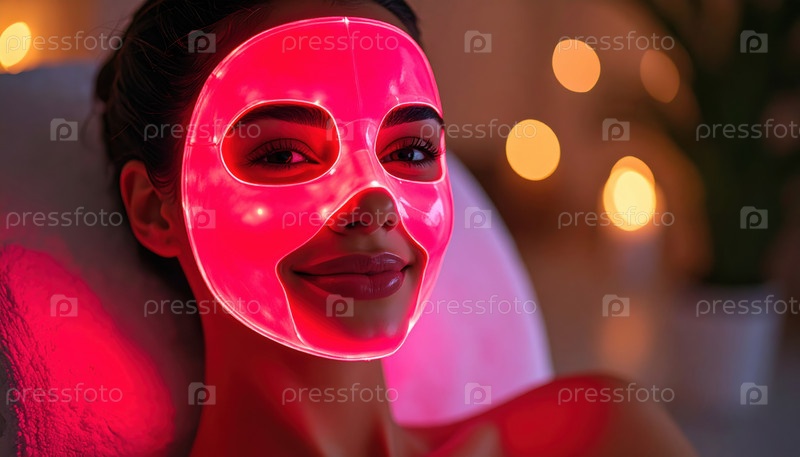 Женщина наслаждается красной светодиодной маской для лицевой терапии в спокойной спа-среде с технологией красоты, инновациями по уходу за кожей и оздоровительным образом жизни