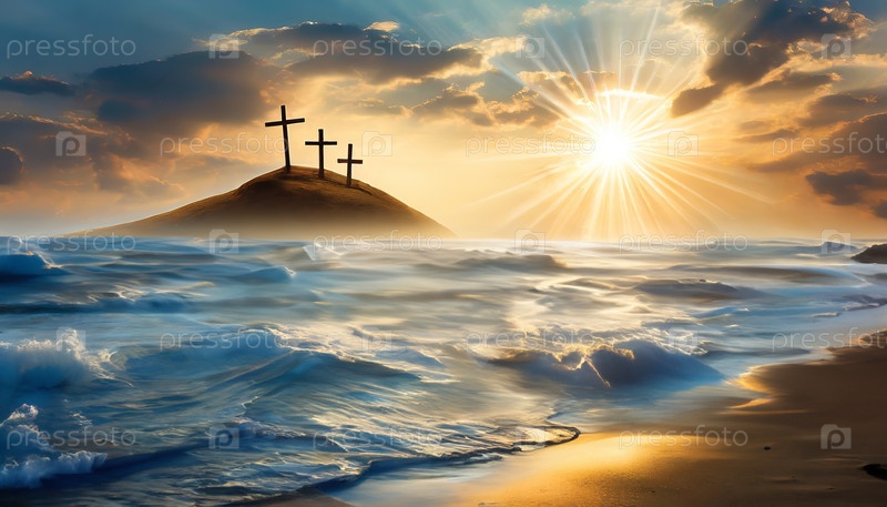 Три деревянных креста на холме во время драматического захода солнца в океане с разрывом волн на переднем плане