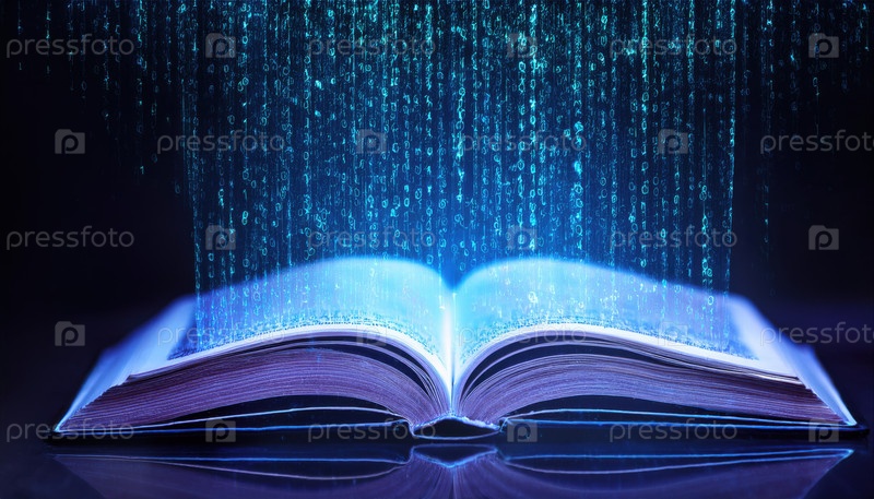 Бинарный код течет вверх из центра открытой книги, светящейся в темном цифровом пространстве