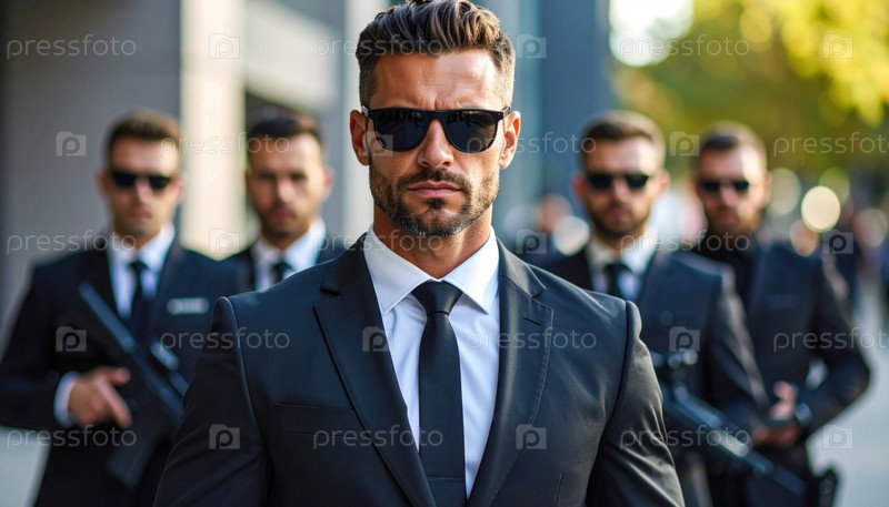 Элитная охранная группа в костюмах защищает высококлассного человека, указывая на безопасность, охрану, службу телохранителя и тенденцию частной безопасности