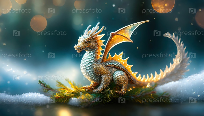 Небольшая детальная скульптура дракона в праздничной обстановке, со снегом и вечнозелеными ветвями в волшебной обстановке