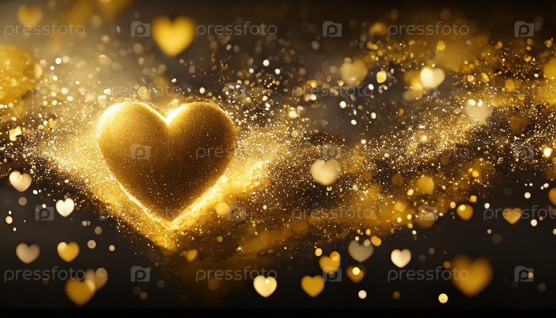 Золотое сердце, сверкающее в волшебном потоке искрящихся частиц и любовная тема