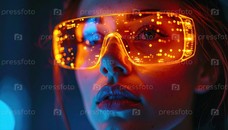 Женщина в футуристических очках дополненной реальности, сияющих оранжевым цифровым светом в темной среде