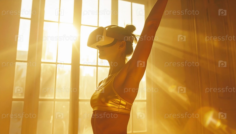 Женщина практикует йогу в гарнитуре VR под ярким золотым утренним светом, символизируя будущие тренды оздоровления и захватывающие цифровые упражнения