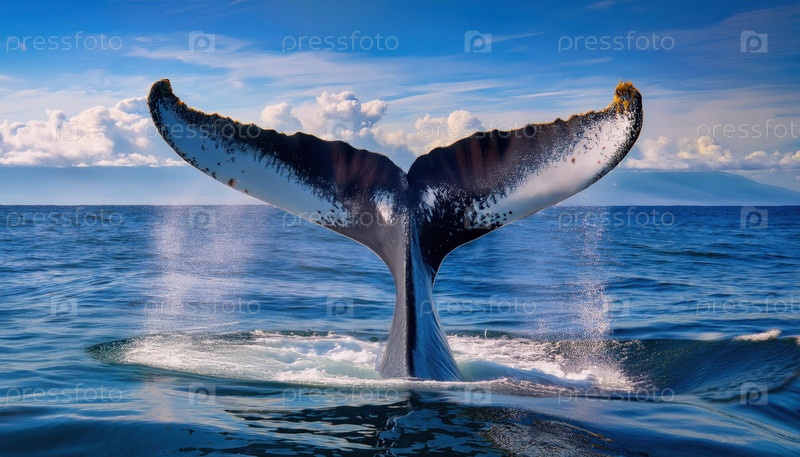Хвост горбатого кита поднимается над поверхностью океана, брызгая водой, когда он ныряет глубоко под голубым небом