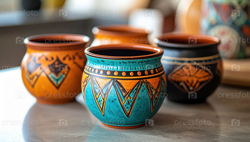 Красочные рукодельные глиняные кружки с племенными мотивами на столе в хорошо освещенной мастерской