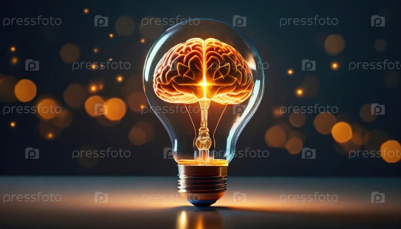 Светящаяся лампочка с человеческим мозгом внутри, символизирующая интеллект, творчество и инновации, окруженная теплым золотым боке на темном фоне