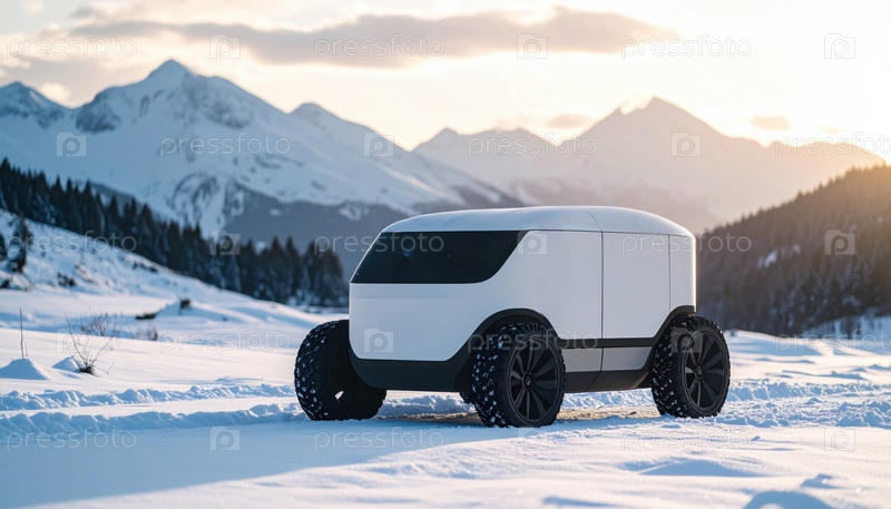 Автономный снегоход, едущий по снежному горному пейзажу, символизирует инновации в экстремальных погодных условиях транспорта и роботизированной мобильности