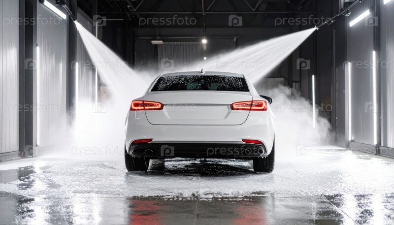 Современный белый седан в высокотехнологичной автоматической автомойке, символизирующей чистоту, удобство и инновационное техническое обслуживание автомобиля