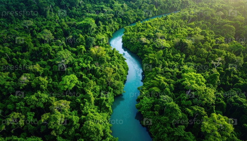 Извилистая река, протекающая через пышный зеленый тропический лес, изображает природу, нетронутую красоту, важность климата и глобальные проблемы биоразнообразия