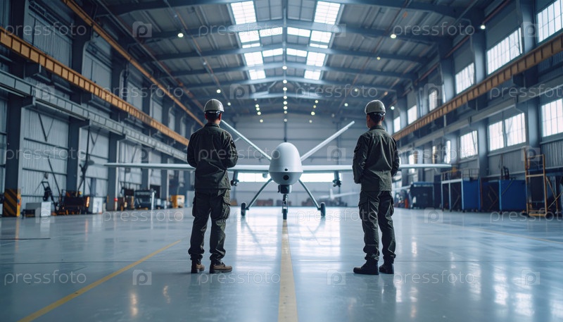 Два инженера в ангаре контролируют большой дрон, символизирующий аэрокосмические инновации, развитие дронов и беспилотные технологии военного класса