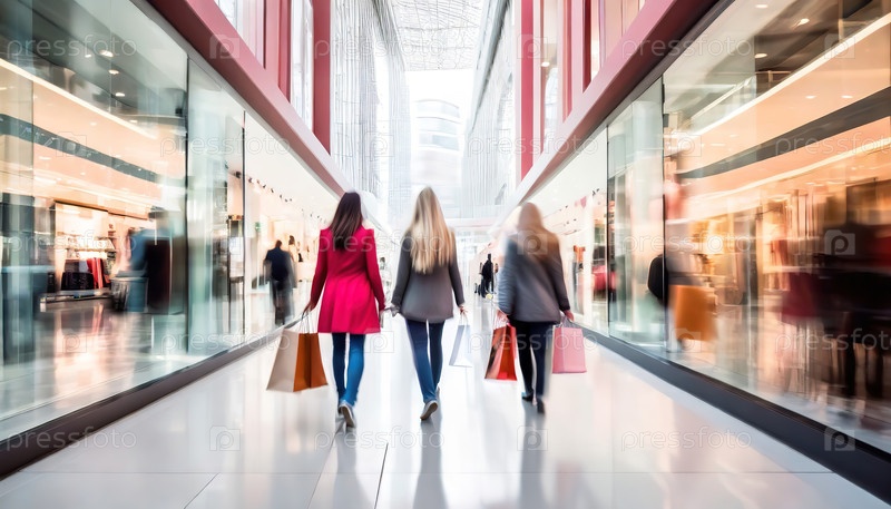 Покупатели ходят по оживленному и современному торговому центру с сумками в руках