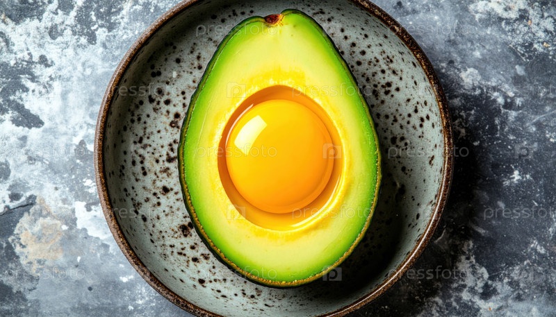 Половина авокадо с семенем, заменяемым сырым яичным желтухом и помещенной в керамическую тарелку на деревенском каменном фоне, представляет собой концептуальное сплав пищи