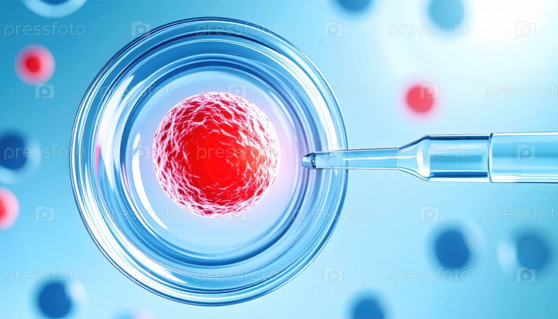 Искусственное оплодотворение женской яйцеклетки АРТ под микроскопом с пипетой, символизирующей биотехнологии, исследования стволовых клеток и инновации в современной медицинской науке
