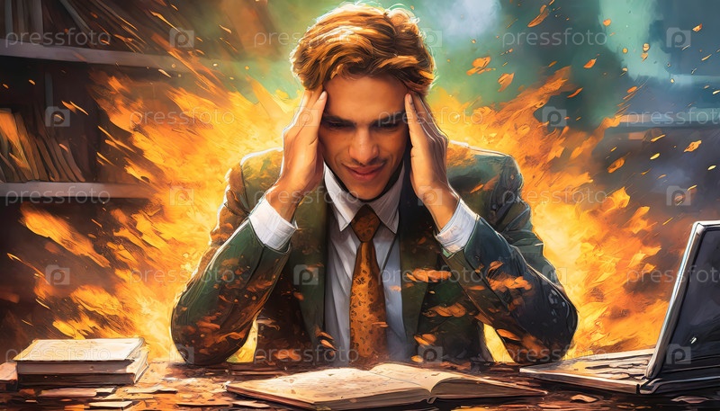 Человек, сидящий за столом вокруг огня символизирует давление, стресс и хаос в драматической библиотечной сцене или на рабочем месте