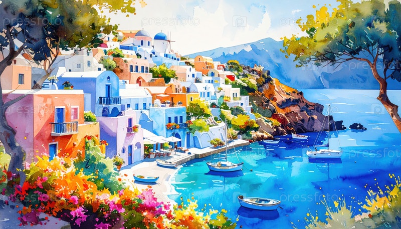Живописная средиземноморская прибрежная деревня с белыми зданиями и рыбацкими лодками под ясным небом идеально подходит для летних поездок или открыток
