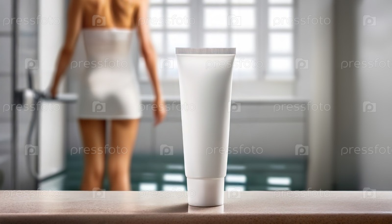 Косметическая трубка на шкафчике в ванной с женщиной на заднем плане, завернутой в полотенце после душа