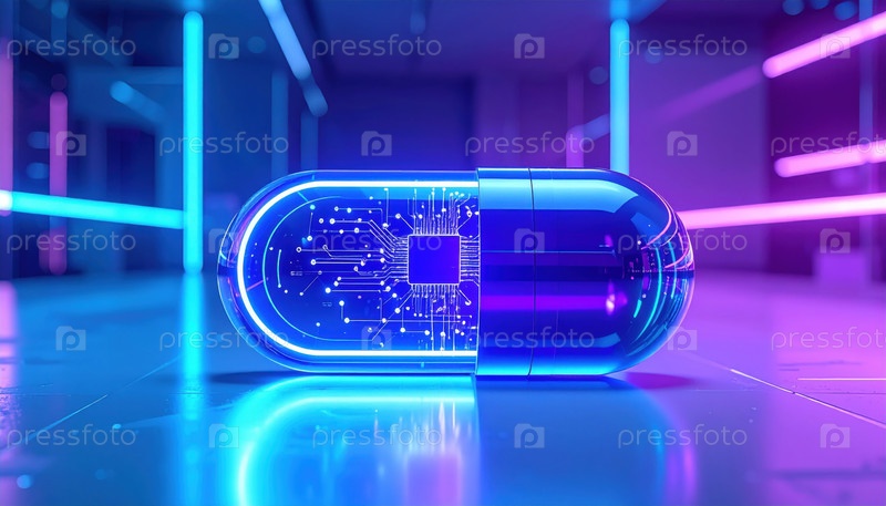 Футуристическая концепция светящейся таблетки, встроенной в цифровые схемы, представляющие передовую медицину или биотехнологии