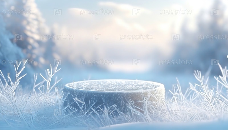 Вид на морозную хоккейную шайбу в снежном пейзаже, окруженном ледяной травой при ярком дне
