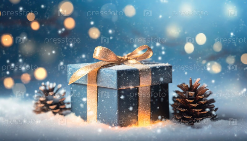 Подарочная коробка в упаковке с золотой ленточкой, помещенной в снег сосновыми деревьями на размытом фоне боке