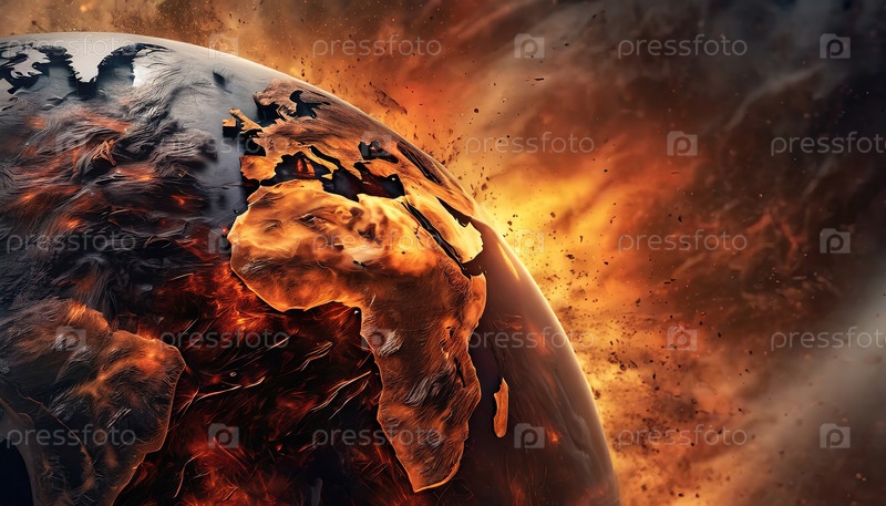 Земной шар покрыт пламенем, демонстрируя интенсивные разрушения на таких континентах, как Африка