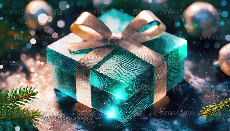 Прозрачная изумрудно-зеленая коробка для подарков со сложными узорами и золотой ленточкой, установленной на снежной поверхности с золотыми украшениями и светящимися огнями