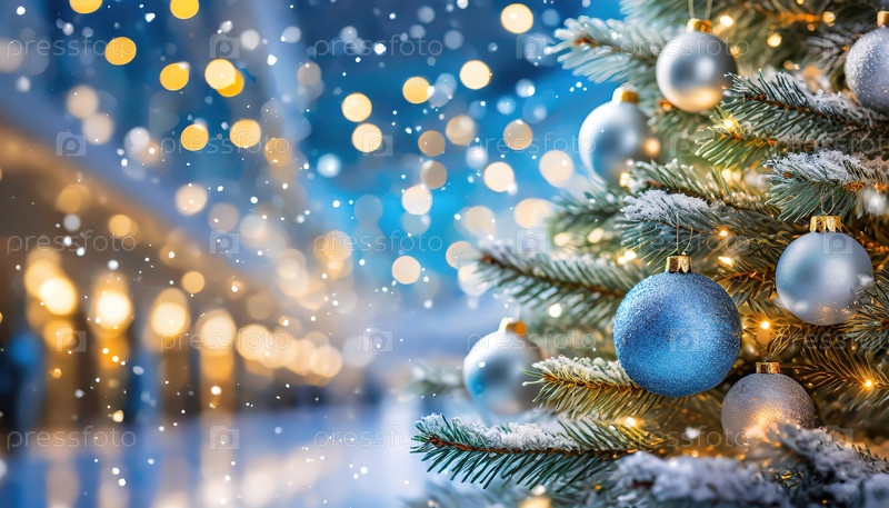 Снежное рождественское дерево с искрящимися синими и серебряными орнаментами, окруженное яркими огнями на заднем плане