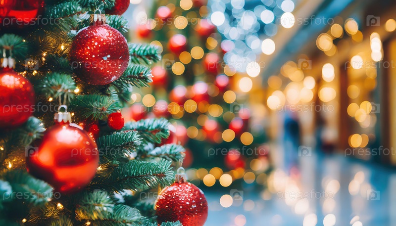 Близкий план красного рождественского орнамента на украшенной елке с теплыми огнями и расплывчатой праздничной атмосферой в фоне
