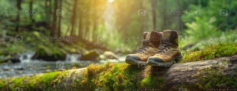Пешеходные сапоги отдыхают на пушистом бревне в яркой лесной обстановке. Летний поток на заднем плане. Панорама с копировальным пространством