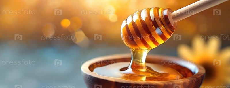 Сверкающая янтарная жидкость каскадирует с посуды, отражая свет на размытом фоне, что говорит о теплой солнечной атмосфере