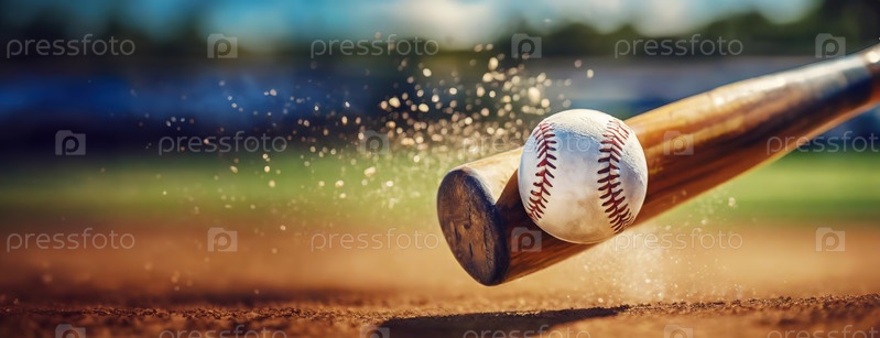 Бейсбол сталкивается с битой. Свинг биты сильно связан с мячом. Скорость и сила в спорте. Панорама с копировальным пространством