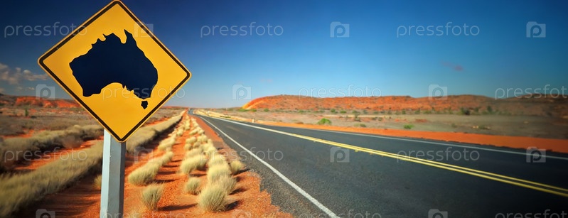 Австралийская дорога с силуэтом карты Австралии, дикой природой и духом приключений. Яркий солнечный день