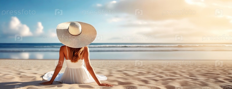 Женщина на пляже, мирное уединение, океан простирается перед ней. Сцена вызывает спокойствие, гармоничное сочетание песка, моря и неба. Панорама с копировальным пространством