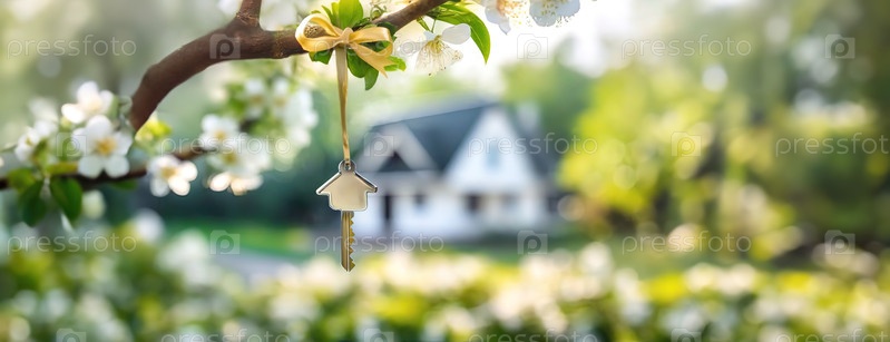 Ключ от дома висит на ветке цветущего дерева в весеннем саду. Цветящий фон, размытый частный дом. Недвижимость, переезд домой или аренда концепции недвижимости. Панорама с копировальным пространством