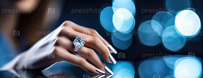 Близкий план женской руки с маникюром, демонстрирующий элегантное кольцо среди размытого света
