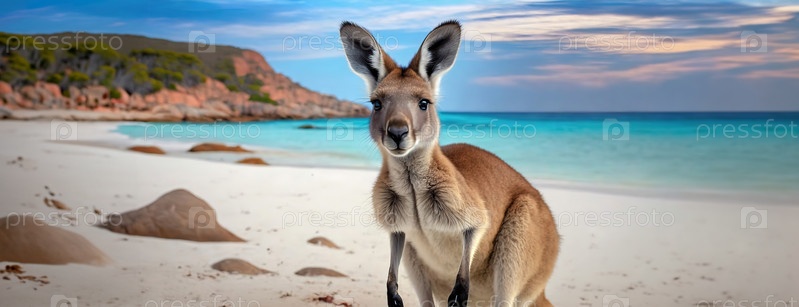 Кенгуру на песчаном пляже с чистой голубой водой на заднем плане. Бирюзовые морские волны мягко бьют по берегу. Концепция Дня Австралии. Лакки-Бэй в Национальном парке Кейп Ле Гранд