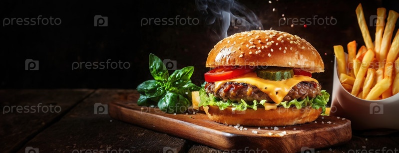 Сочный чизбургер с паром, поднимающимся рядом со золотыми картофелями-фри. Вкусные блюда из говядины, украшенные тающий сыр на обжаренном булочке. Панорама с копировальным пространством