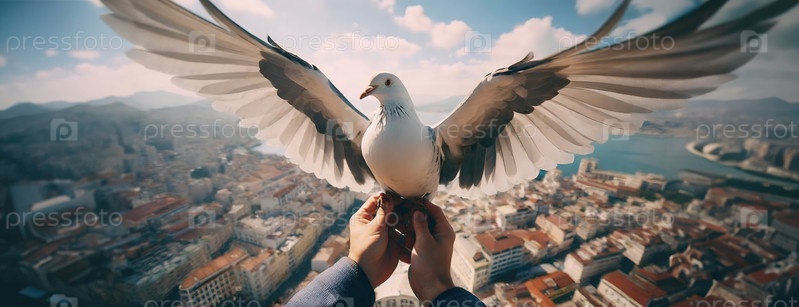 Голубь расширяет свои крылья, тщательно удерживается человеческими руками против городского пейзажа, символизируя мир и свободу