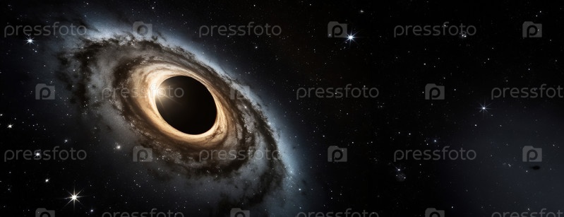 Черная дыра вращается по спирали в глубоком космосе, окружена звездами и космической пылью.Гравитационное явление притягивает материю, зрелище тайн Вселенной.Панорама с копированием пространства