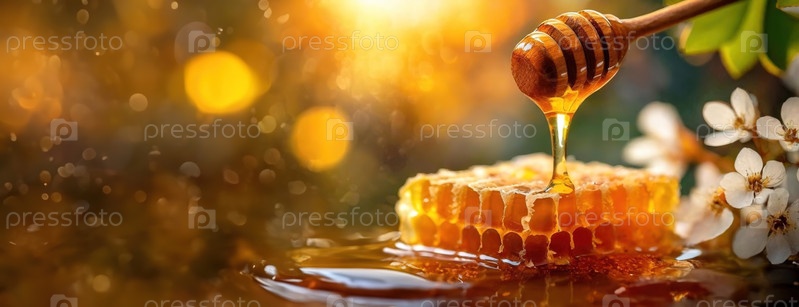 Золотой мед медленно капает от диппера до сотовой части.Глубокое золотистое вещество просачивается с липкой консистенцией на шестиугольные восковые клетки, окруженные нежными белыми цветами.Панорама