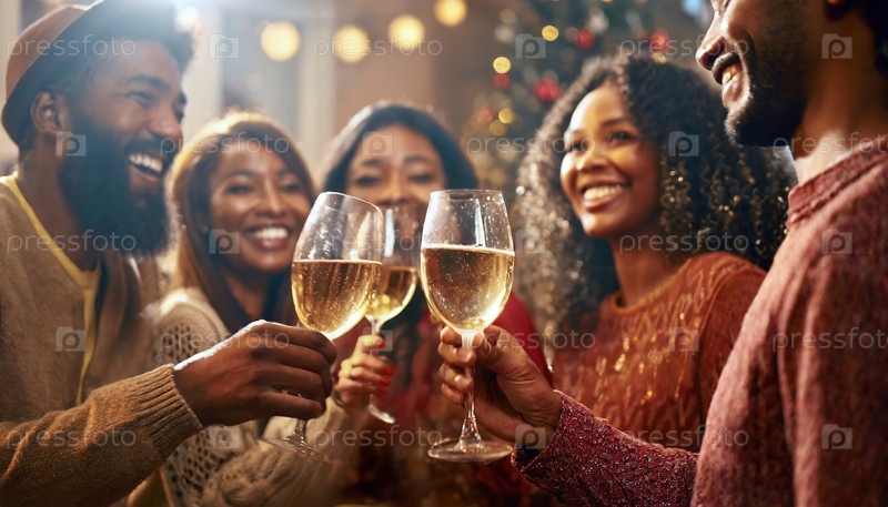 Группа друзей отмечает праздничный сезон, держа в руках бокалы шампанского с праздничными украшениями и огнями на заднем плане