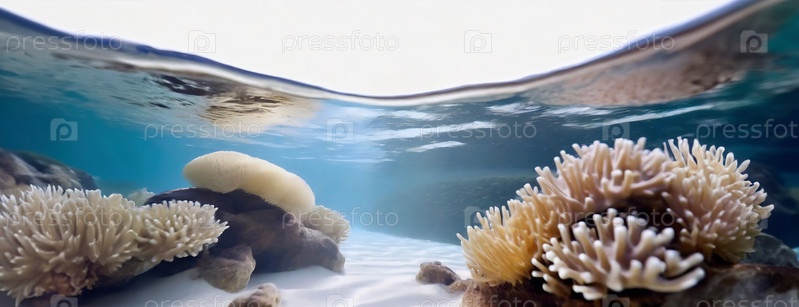 Спокойный подводный вид с отбеленными кораллами на морском дне. Изменение климата и воздействие человека на окружающую среду. Панорама с копировальным пространством