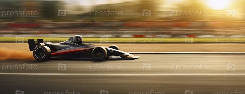 Гонка автомобиля на скорости на трассе при закате солнца. Высокоскоростная Формула-1, динамические эффекты движения, которые улавливают интенсивность гонки чемпионата. Панорама с копировальным пространством